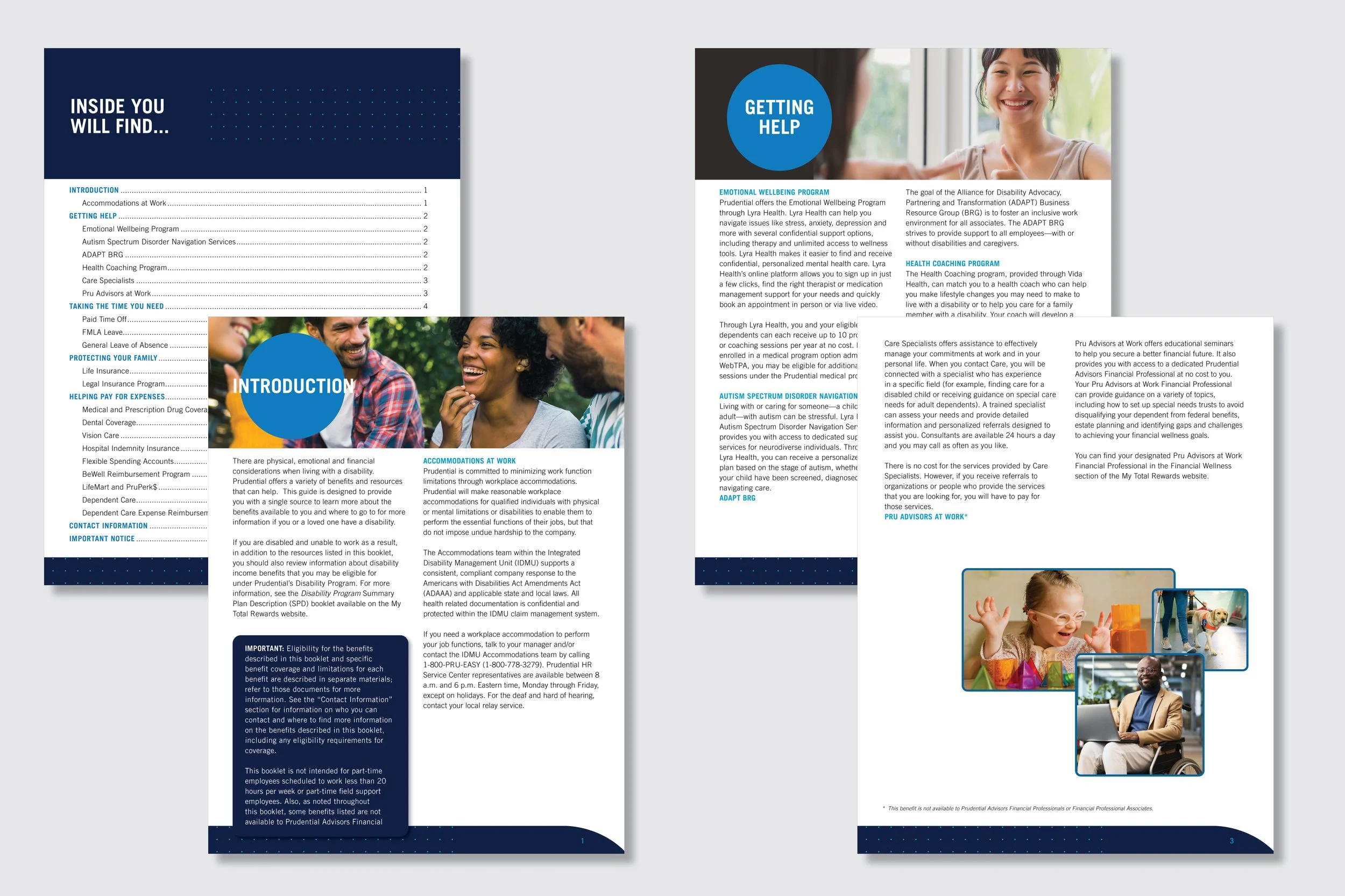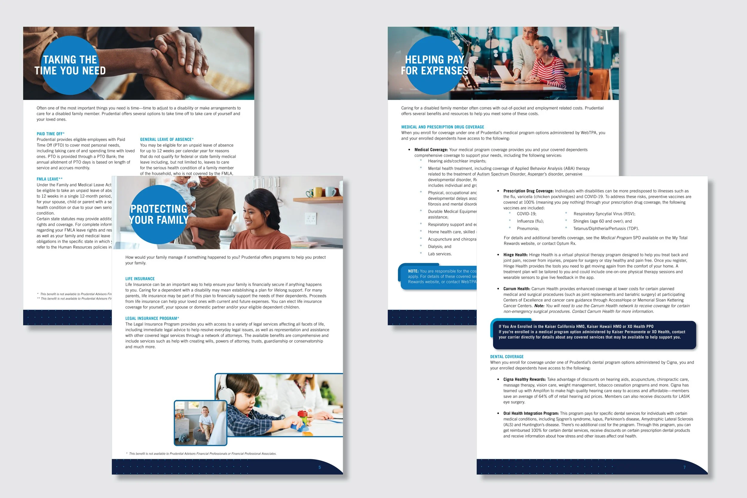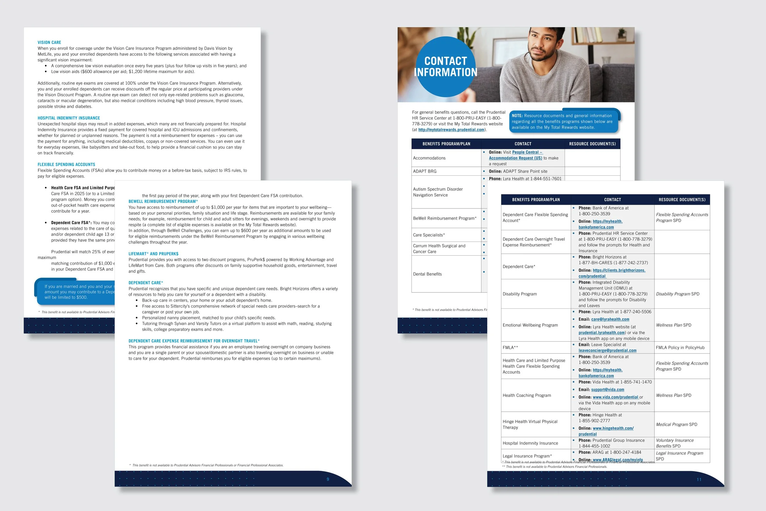 Prudential Insurance Company, a global leader in financial services and investment management, offers a wide range of products including life insurance, annuities, and retirement solutions. They also provide a suite of specialized internal services for employees and needed a set of cohesive brochures that communicated this information clearly. The goal was to apply their branding in a fresh, distinctive way—consistent with the Prudential identity while still setting these materials apart from their core brand.