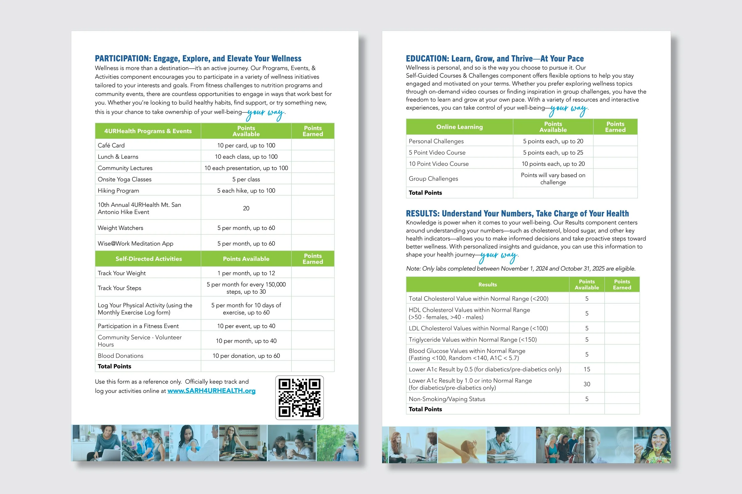 San Antonio Regional Hospital is a medical facility in Upland, California, offering a wide range of acute care services. I’ve partnered with their HR team for many years to support their employee communications, designing custom materials that explain each year’s benefit offerings clearly and effectively. SARH also uses its own campaign name and logo, 4URHEALTH, which we consistently integrate into both the messaging and visual design. Their bright, approachable brand allows for a lot of creative flexibility, with each year featuring a fresh, distinct look. This most recent design was applied across a full suite of materials, including a tri-fold brochure, postcard, time reader, flyers, portal banners, and letters.